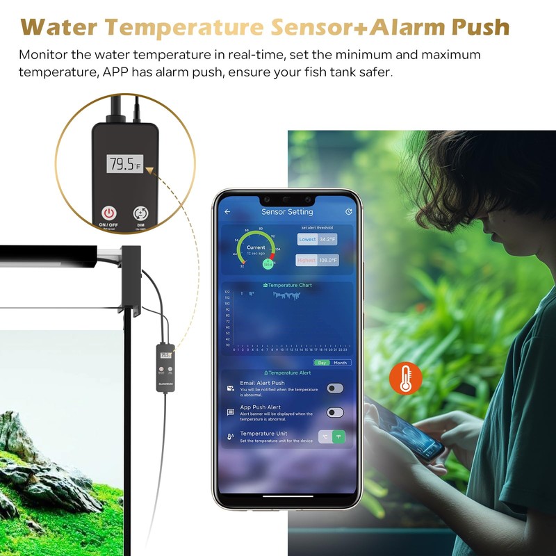 - 【Real-time Water Temperature Sensor】This freshwater fish tank light with real time temperature sensor. This feature can monitor the water temperature of your fish tank in real time, that you can ensure your aquarium environment is kept within the ideal set temperature range. With temperature alert push, your mobile and E-mail can receive notifications after exceeding the set temperature.