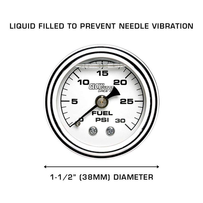 GlowShift Liquid Filled Mechanical 30 PSI Fuel Pressure Gauge - White Dial - Waterproof - Installs Under The Hood - 1/8-27 NPT Thread - 1-1/2" (38mm) Diameter