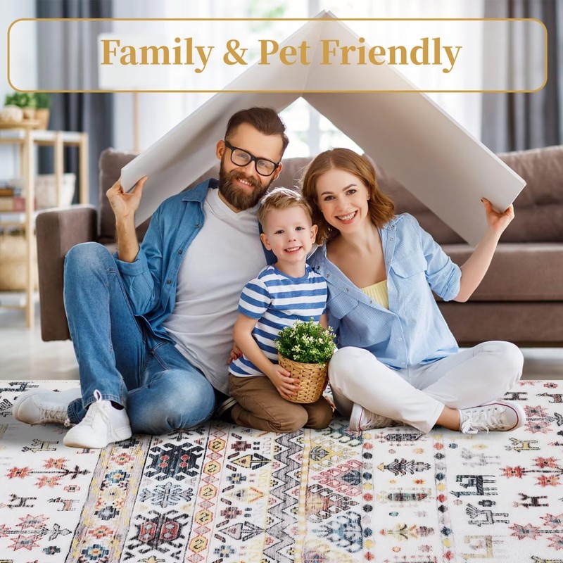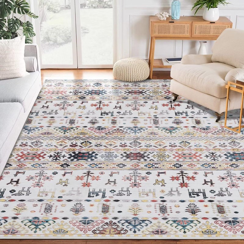 GlowSol Boho Area Rug 8x10 Washable Rugs Large Moroccan Rug Non-Slip Non-Shedding Rug Tribal Print Floor Carpet Soft Distressed Carpet Foldable Rug Bedroom Dining Room Office Farmhouse