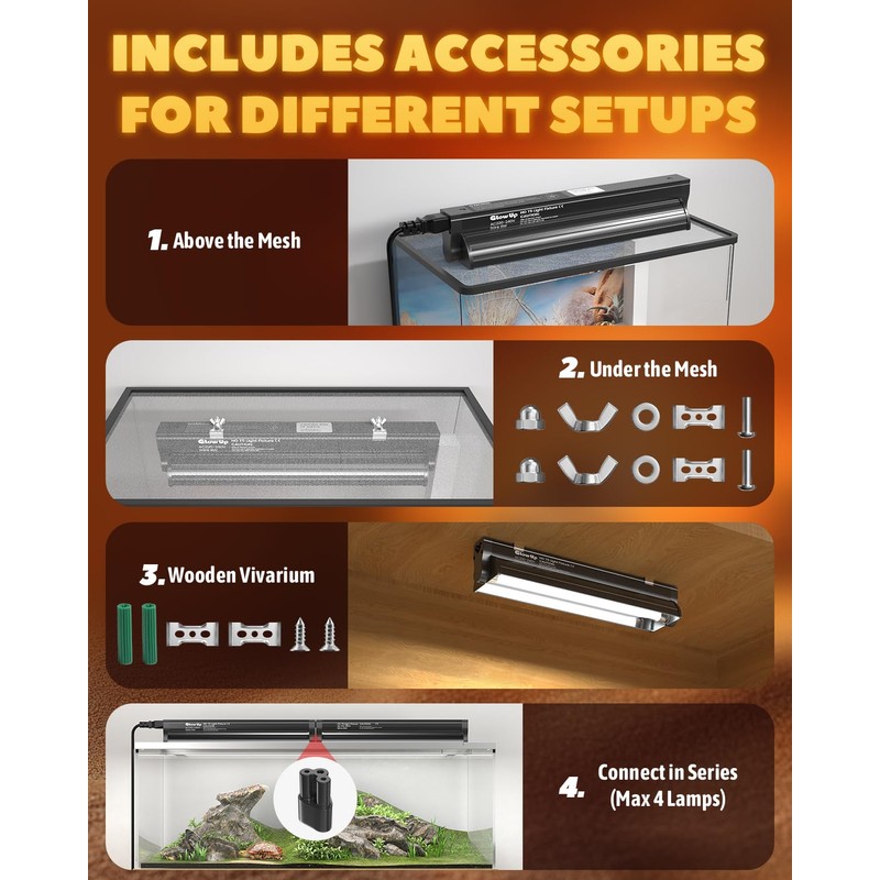 • Specifications: UVB light fixture length 31.5 cm, T5 tube length 30 cm, power cable 1.8 m, suitable for small enclosures, accessories include a series connector so that you can link up 2 light fixtures for larger setups (Max 4 fixtures)