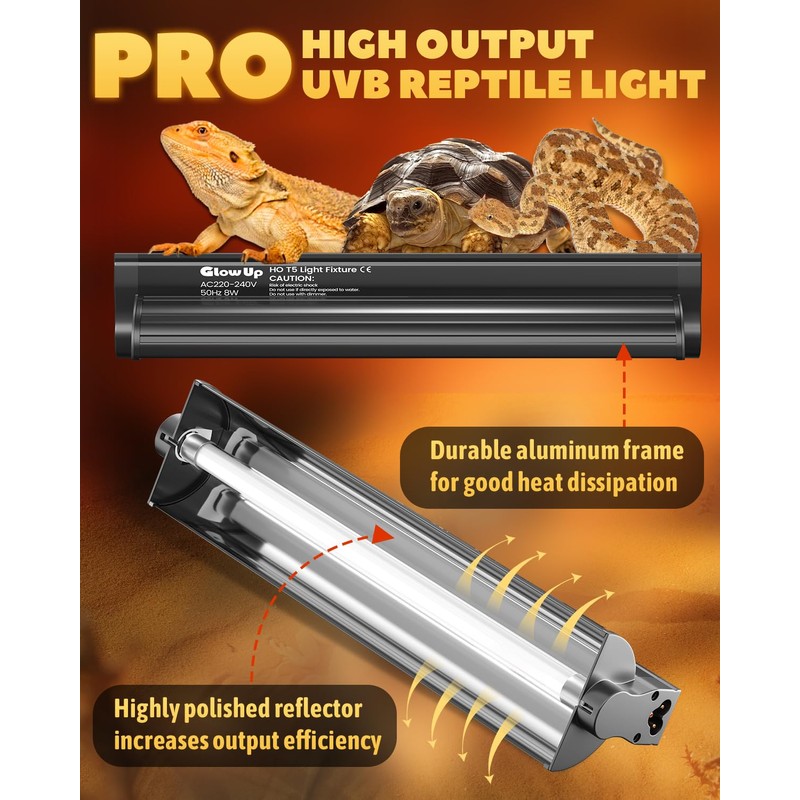 GlowUp 8W T5 UVB Light Reptile Kit, 10% UVB for Tropical Desert Reptiles, 31.5cm / 12.4in UVB Reptile Light Fixture with High Output T5 UVB Tube for Bearded Dragon, Lizard, Tortoise, Gecko