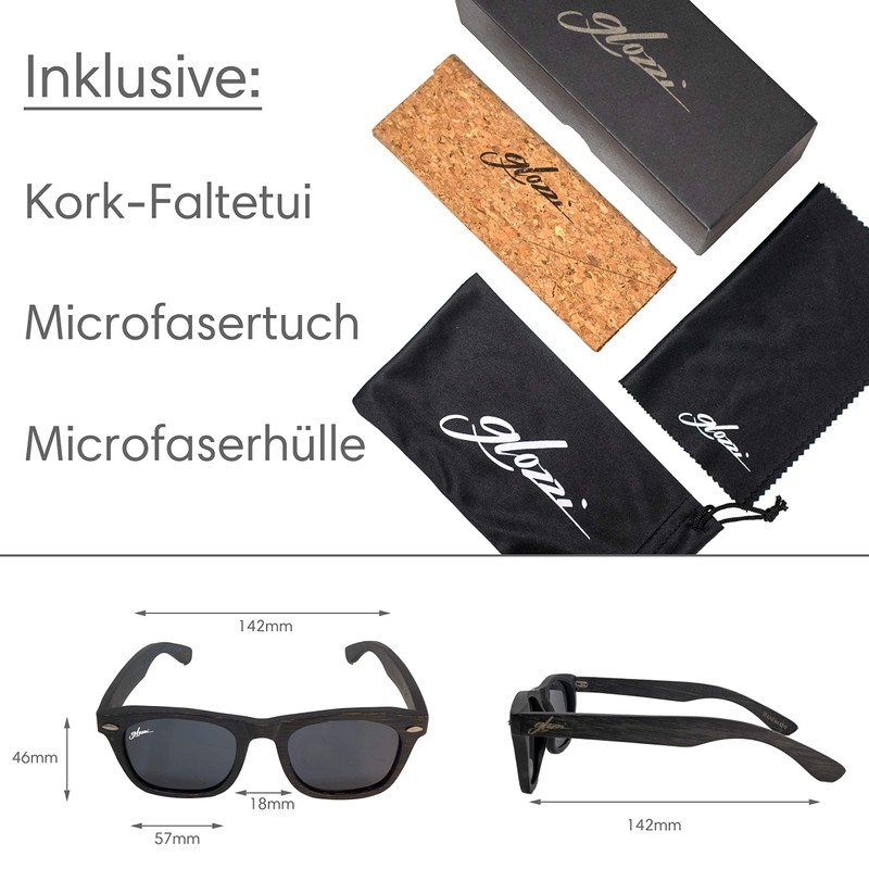 glozzi Bamboo Wood Sunglasses for Men and Women Polarised & Mirrored Glasses UV 400 Category 3 with Cork Case - Black