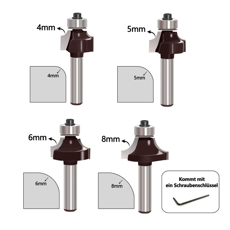 • Suitable size: rounding cutter edge cutter with 8 mm shank, 4 mm / 5 mm / 6 mm / 8 mm radius. Cutter with axle angle result in clean and smooth roundings, 4 different sizes of rounding cutters. Perfect for stencil cutting work and other DIY projects.