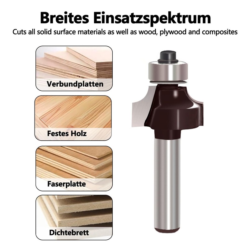 High-quality bearings. Thanks to the use of high-quality bearings with high speed, high concentricity and low friction resistance, it is perfectly matched to cutters. High-strength carbon steel shafts. The shaft of the rounding cutter is made of high-strength carbon steel, which has better durability and service strength. An 8 mm shaft diameter can effectively suppress vibrations during use. Carbide alloy blade. After high-quality heat treatment, carbide blades can perform clean and accurate cutting on all types of wood with sharper edges and higher cutting efficiency, resulting in a clean cutting surface and a better cutting effect. Suitable for multiple materials. Rounding cutter. Suitable for solid wood, MDF, laminate, chipboard, compact plywood and other synthetic woods, it is ideal for levelling, updating or planing the surface of your wood