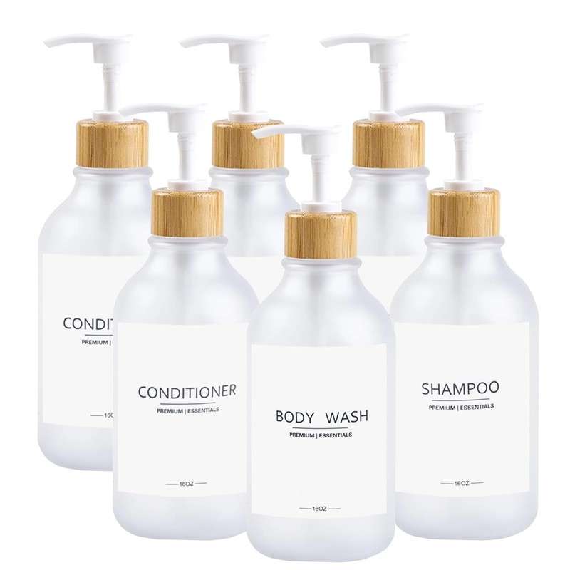 GlrYer Shampoo and Conditioner Frosted Bottles Bamboo Pump, Refillable Shampoo Bottles for Lotion Oil Shower Soap Dispenser (6, 6p-Clear)