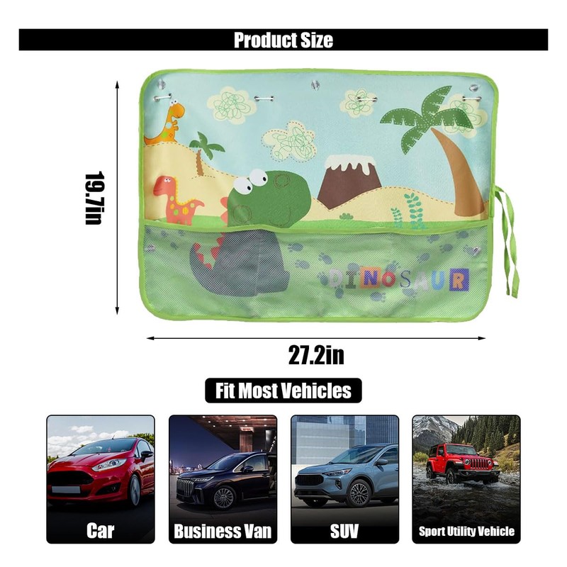 GLSOWEE Car Window Shade for Baby, Blackout Car Window Curtain with Storage Pockets & 7 Suction Cups, Cartoon Pattern Car Side Window Sun Shade Cover for Sun/Heat/UV Rays Protection (Green-Dinosaurs)