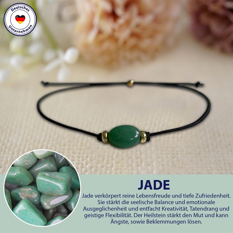 - Healing stone bracelet – The filigree gemstone bracelet consists of an anthracite-coloured elastic textile band with a jade stone and two small gold beads