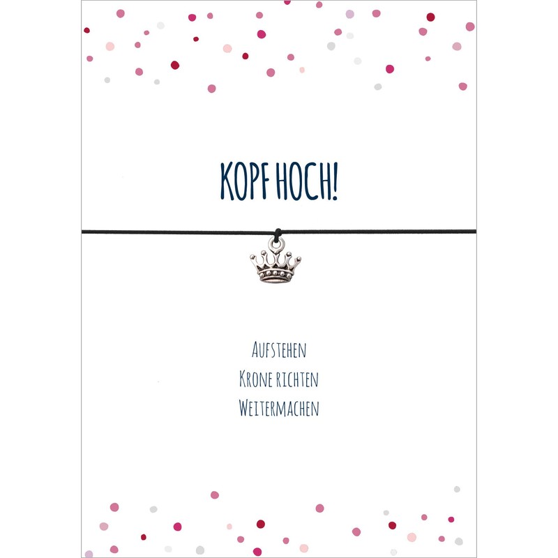 Glücksschmiedin - Motivational Bracelet Head High in Black with Silver-Coloured Crown Pendant and Saying Card, Handmade Locally, Metal