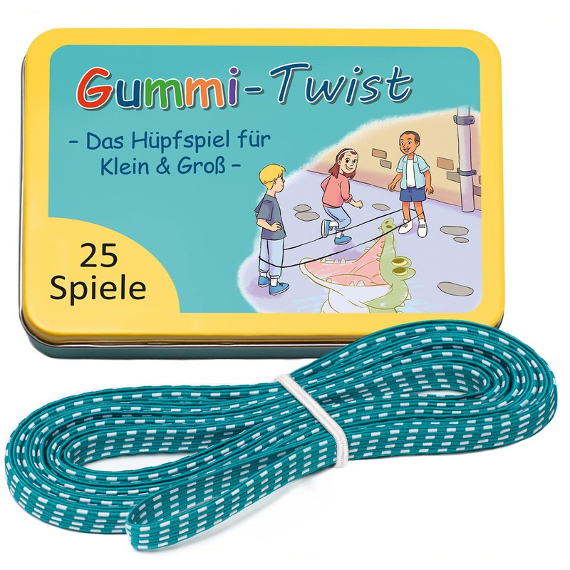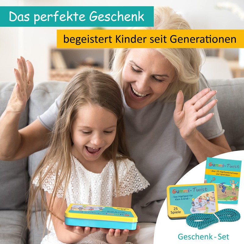 - Premium quality: While other rubber cords are too short or cut into the skin, we have thought of everything with our Gummitwist set. The perfect rope length (4 m long), comfortable on the skin (1 cm wide), with a high-quality metal box as gift packaging, this children's toy has everything you need.