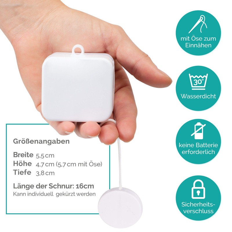 - Waterproof and baby safe: We place the highest importance on the quality of our products, especially the details. Our musical mechanism convinces with a waterproof housing. You no longer have to remove the music box from the casing, but you can simply wash it in the washing machine. In addition to the wind-up music box, you will receive a safety lock, which cannot be loosened and swallowed by toddlers. With our music, you are on the safe side.