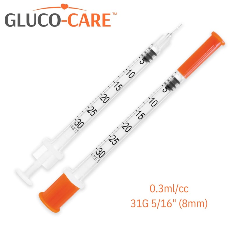 GLUCO-CARE GLUCO-CARE 0.3 ml/cc Syringes 31G x 5/16 (8mm), Orange Cap, Box of 100 pcs
