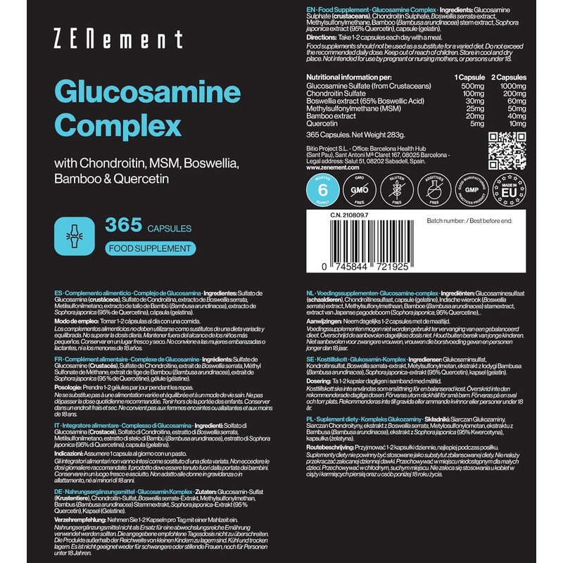 Glucosamin & Chondroitin Hochdosiert, 365 Kapseln mit Chondroitin, MSM, Boswellia, Bambus und Quercetin | ohne Zusätze | Zenement