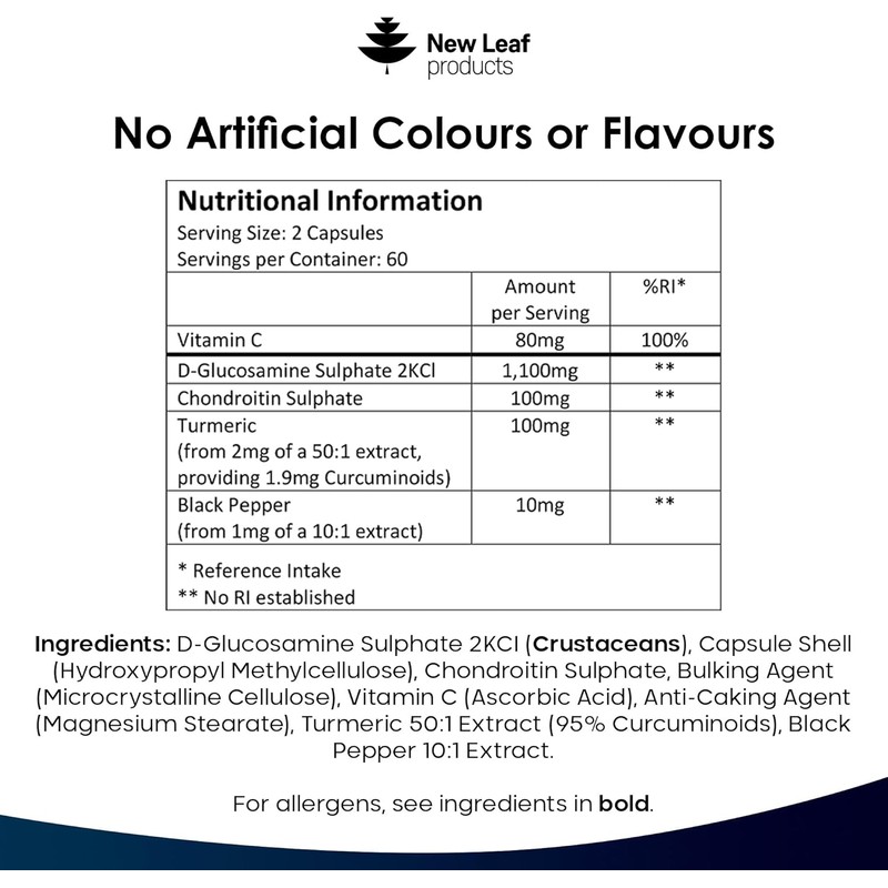 • GLUCOSAMINE AND CHONDROITIN HIGH STRENGTH - Each serving of New Leaf supplement contains 1100mg of Glucosamine Sulfate, 100mg of Chondroitin Sulphate, 100mg of Turmeric 10mg of Black Pepper and 80mg of Vitamin C. Each bottle is good for 2 months with the recommended 2 capsules daily.