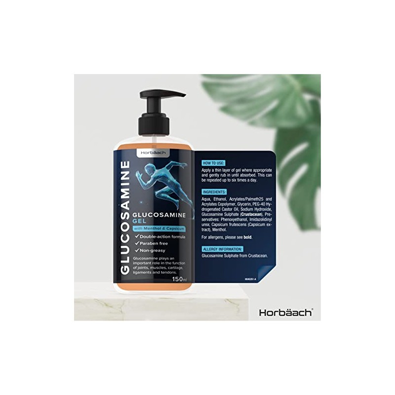 - HORBAACH GLUCOSAMINE GEL?: Our expertly-crafted formula includes Glucosamine Sulphate derived from Crustacean, as well as Menthol & Capsicum.