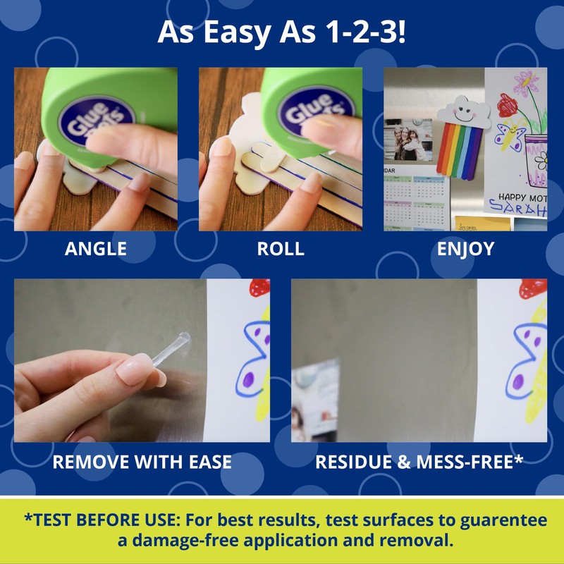 Glue Dots, the original ready-to-stick double-sided adhesive dots, are the clean and safe alternative to liquid glues, hot-melt glue guns, and tapes. Our crafting glue comes in easy-to-use disposable applicators, rolls, and sheets instead of the traditional bottle or stick to help eliminate mess. Our double-sided Glue Dots are available in temporary and permanent adhesive formulas that are specifically designed to make projects around your home, school, or office simpler. Our craft Glue Dots are easy to use regardless of age or ability, acid-free, photo-safe, and kid-friendly. These super-sticky dots are designed to work on a variety of materials including paper, glass, metal, plastic, wood, foam, cardstock, photos, and more. Glue Dots are the perfect adhesive solution to make your life easier.