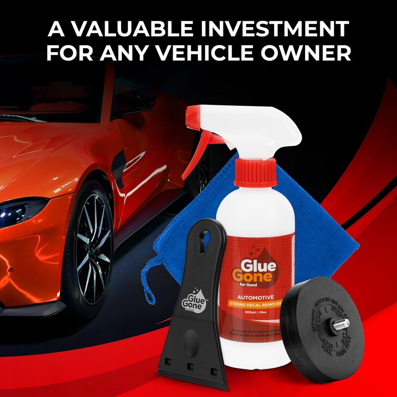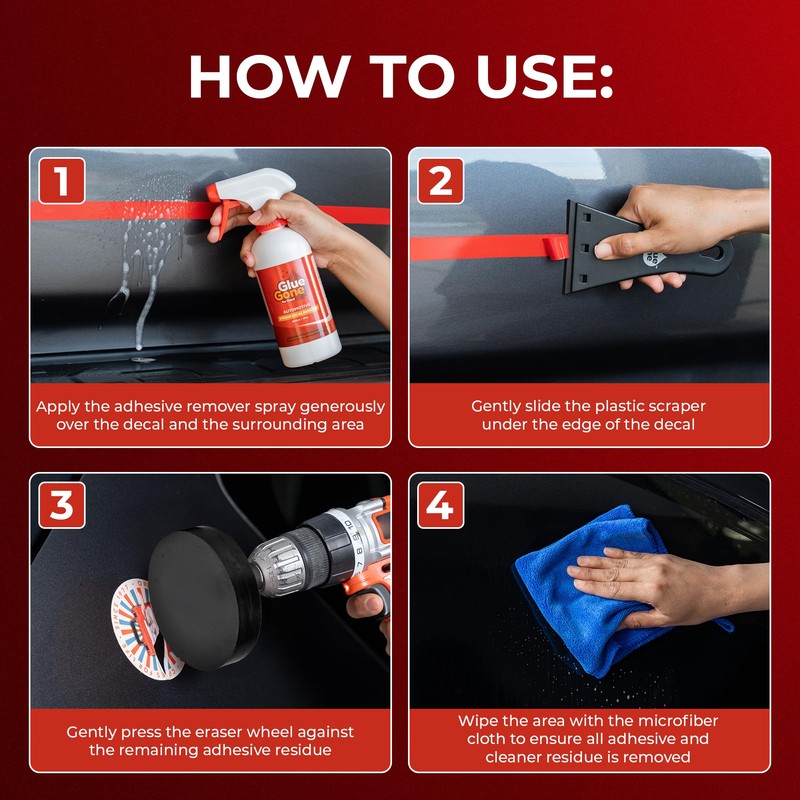 - SPEEDY SOLUTION: Slash your decal removal time with our all-in-one kit! The combination of Glue Gone adhesive remover and the eraser wheel outperforms heat guns and razor blades for a faster, hassle-free experience.