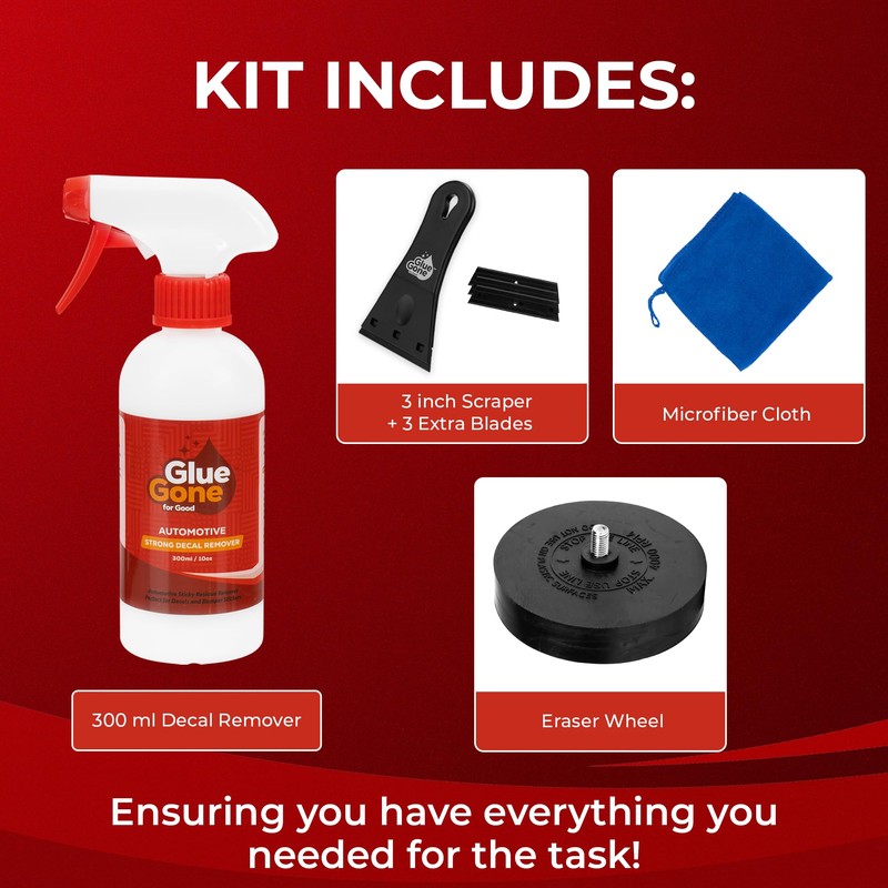 Glue Gone Decal Remover Kit - Includes 10-oz Adhesive Remover, Eraser Wheel, Microfiber Cloth, 3-inch Scraper with 3 Blades - Complete Set for Removing Decals, Stickers, & Adhesives from Cars & More