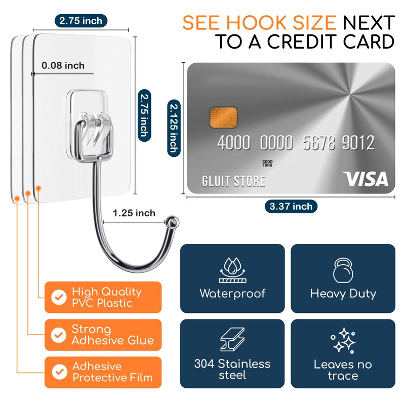 - Premium materials: Adhesive hooks crafted from robust stainless steel and durable PVC; high quality and longevity; remain clean and unaffected by time; non-toxic, recyclable, and transparent.