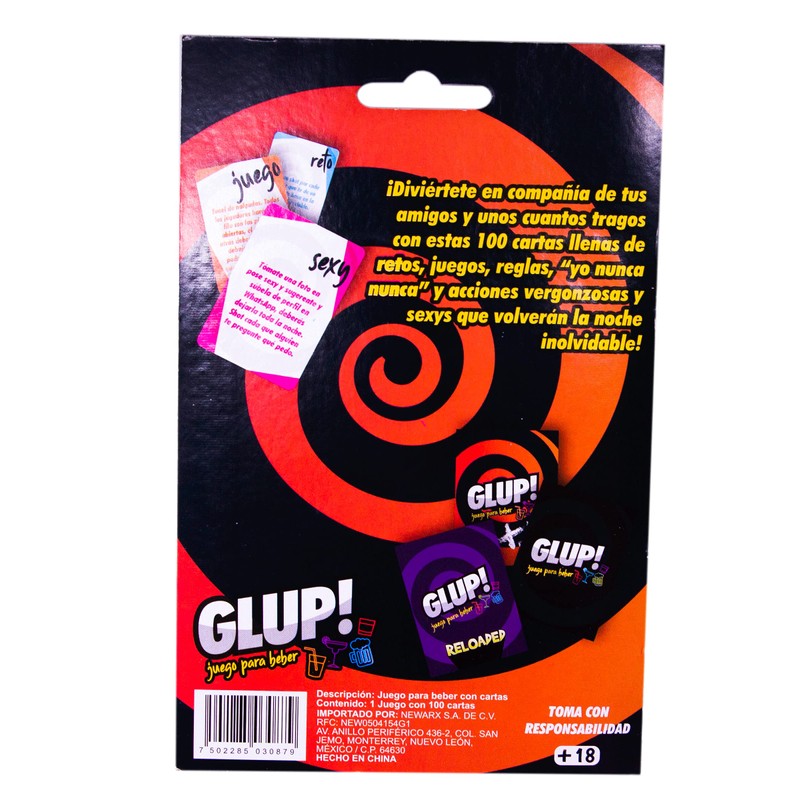 - Incluye GLUP Reloaded y GLUP Extreme. Cada GLUP contiene 100 cartas llenas de retos y acciones vergonzosas y sexys que volverán la noche inolvidable.