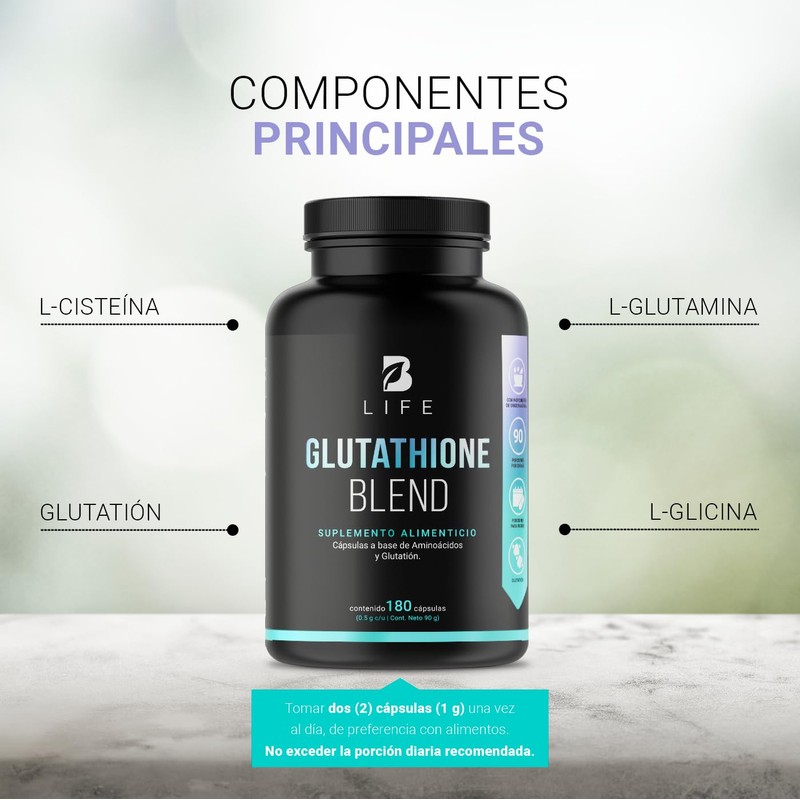 - ¡Disfruta la formulación de Glutathione Blend B Life! Diseñada a base de Glutatión, L-Cisteína, L-Glutamina y L-Glicina. Componentes esenciales para el estrés oxidativo. Contiene 180 cápsulas.