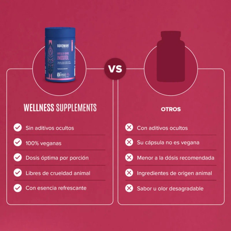 - based y cruelty free. Este suplemento refleja el compromiso de Birdman con la sostenibilidad y la transparencia, ofreciendo un producto que combina calidad, confianza y respeto por el medio ambiente. Diseñado para integrarse a estilos de vida modernos, es una elección práctica y consciente para quienes valoran su nutrición diaria. Este producto no es un medicamento. El consumo de este producto es responsabilidad de quien lo recomienda y de quien lo usa. INGREDIENTES: Myo Inositol D