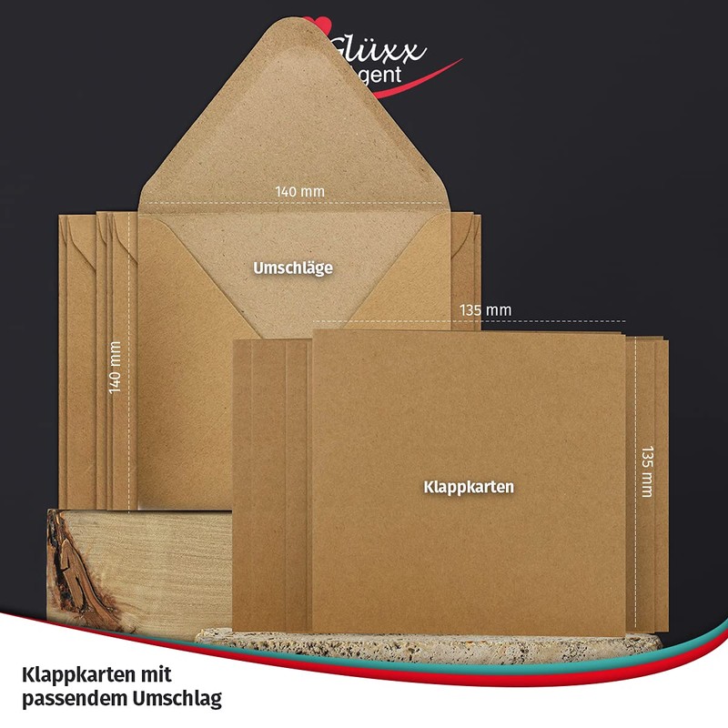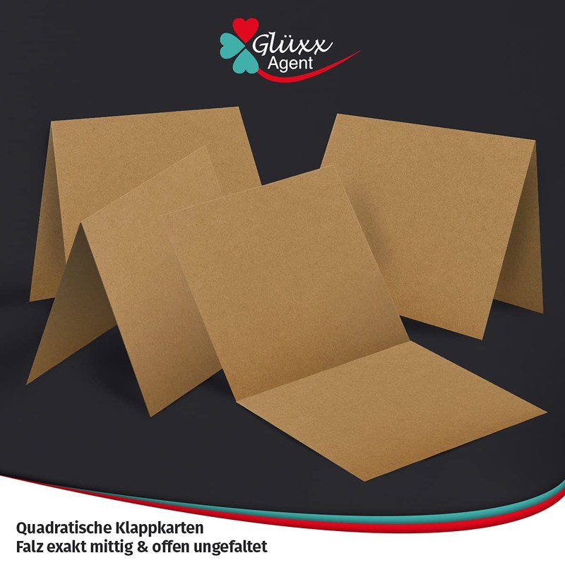 Glüxx-Agent 30 Kraft Paper Card Set Square Folding Cards 135 x 135 mm with Envelopes, 140 x 140 mm,Brown