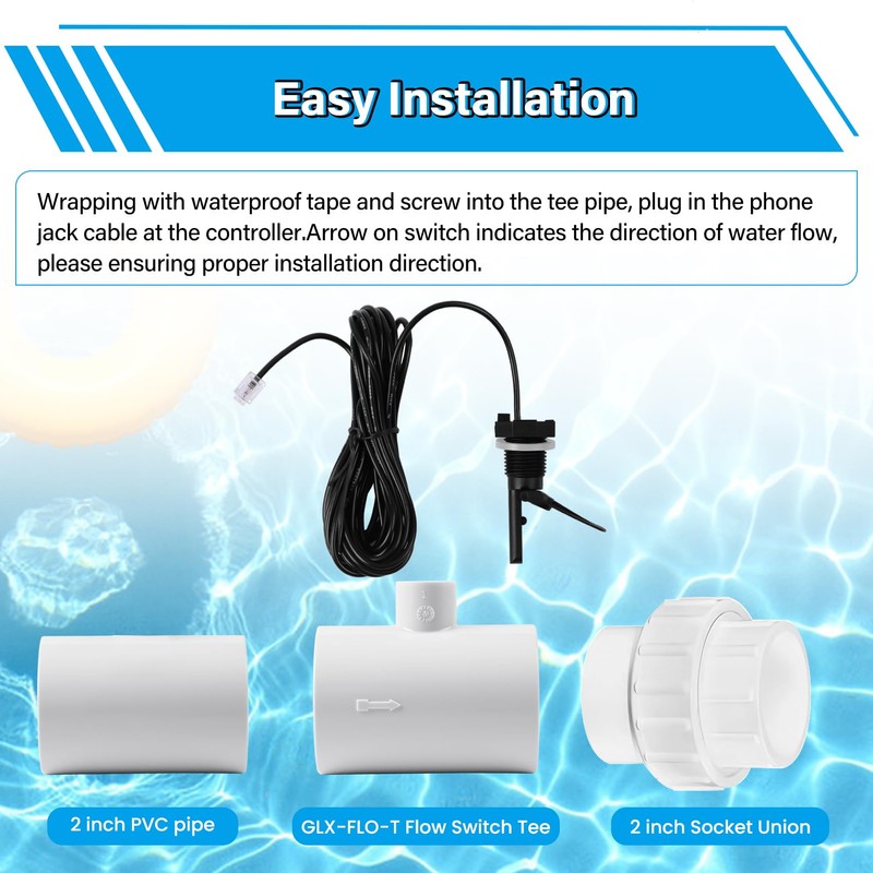 - 【GLX-FLO-RP Flow Switch Assembly】: The GLX-FLO-RP Pool Flow Sensor can monitor the water flow rate in your saltwater system, make sure chlorine gas doesn't build up when there's no water flow, protect your pool and equipment from any harm.