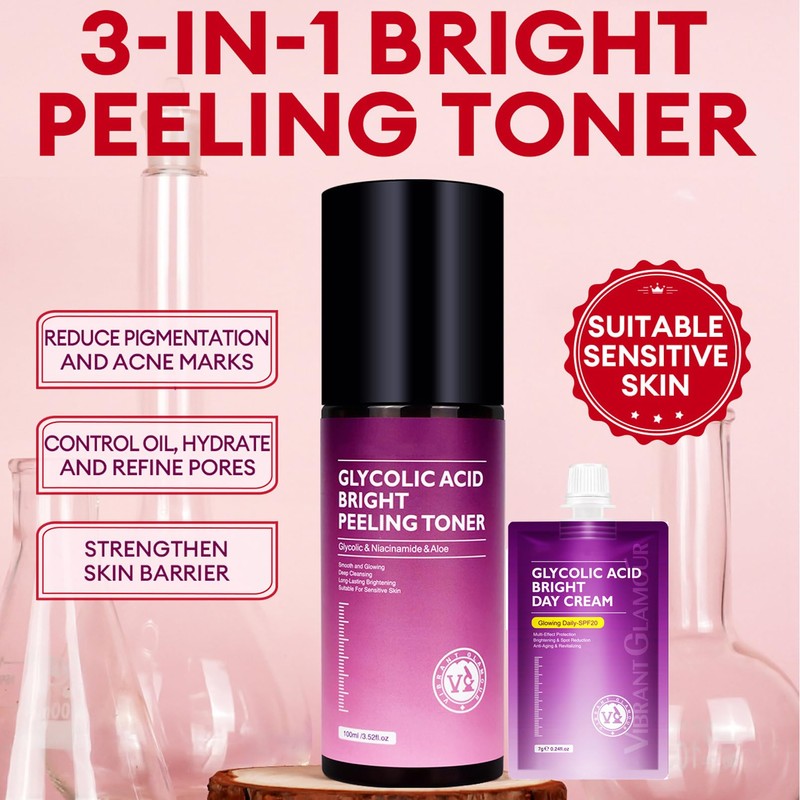Glycolic Acid Toner, Glycolic Acid Toning Solution, Hydrating Toner for Face & Body, Pore Minimising Face Toner, Exfoliating Serum for Blemishes, Dark Spots & Dull Skin Brightens Vegan Friendly, Suitable for Normal/Oily Skin Package Includes: Glycolic Acid Toner 100ML Glycolic Acid Bright Day Cream 7g Minimises Pores and Controls Oil - Target enlarged pores and oily skin with our pore-refining glycolic acid serum toner. This lightweight facial toner helps decongest pores and prevent breakouts caused by excess oil, leaving your skin feeling refreshed, clean, and balanced without dryness Pore Minimising Face Toner - This Glycolic Acid exfoliator works as a pore minimising toner, reducing blackheads and fine lines, as well as supporting smoother and brighter skin. Facial toner also penetrates deep into the pores to remove deep-seated dirt and oil, helping to eliminate existing acne and pimples.