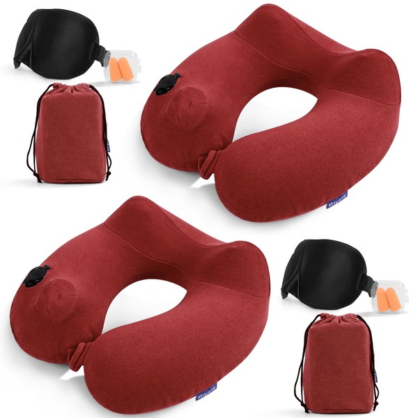 Glyzia 2 Pack Inflatable Travel Neck Pillows for Airplanes, Head Support Velvet Adult Neck Pillows for Long Flight, Kit with Eye Mask, Earplugs and Storage Bag, 2, Red