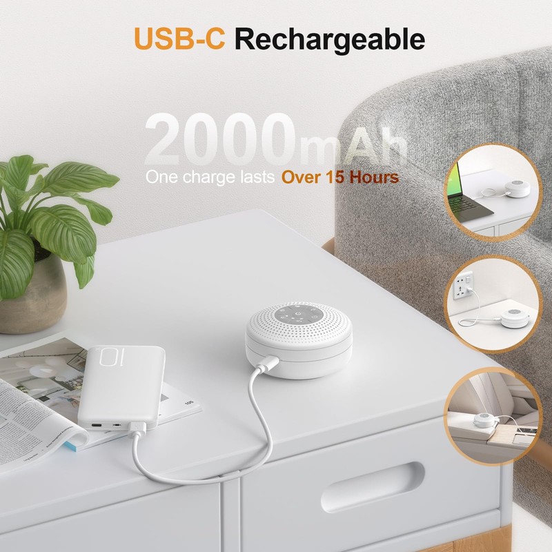 - Over 15 Hours Lasting Time - The portable sound machine is built with huge 2000mAh rechargeable battery compared with 1200mAh of others, one charge can last more than 15 hours to ensure that you can easily use it all night.USB convenient charging also allows you to not worry about charging problems during the trip,you can use power bank,car charging,computer charging etc.