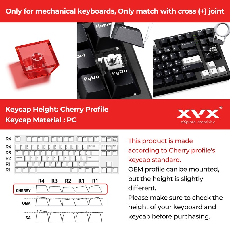 - Note:This product is made according to Cherry profile's keycap standard. OEM profile can be mounted,but the height is slightly different. Please make sure to check the height of your keyboard and keycap before purchasing.