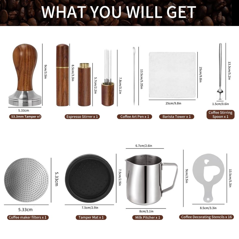 - 24Pcs espresso accessories tools barista set, including1* 53.3mm coffee tamper 1* latte art pen 16* decorating stencils 1* coffee stirring spoon 1* 350ml milk frothing pitcher 1* coffee tamper mat 1 * barista towel 1*WDT tool 1*53.3mm Espresso Puck Screen ,this kit isIdeal Gift for Coffee Lovers(Fits for54mm Portafilters)