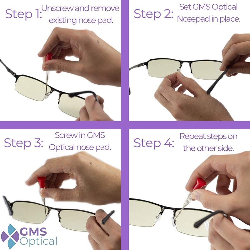 - » Don’t waste time and money on new glasses. Use GMS Optical Screw In nose pads to revive your frames and bring new comfort and life to your glasses!
