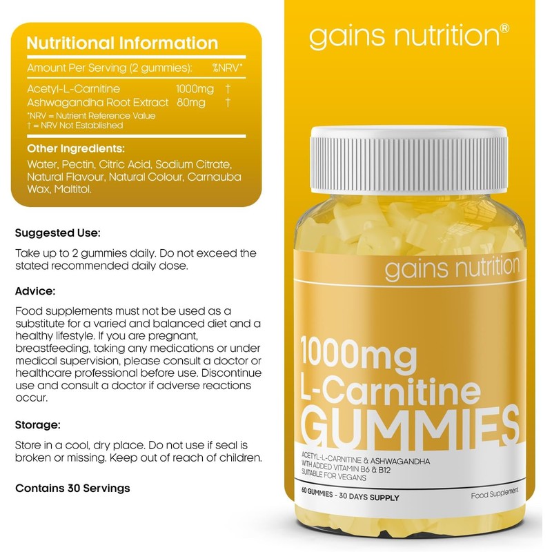 - Gains Nutrition has developed these tasty Acetyl-L-Carnitine Gummies for fitness enthusiasts, bodybuilders and both male and female athletes. Our chewable L-Carnitine Gummies come in natural mango flavour and offer 60 Gummies per bottle for a 30 day supply. Take 2 Gummies per day for a 1000mg serving of Acetyl-L-Carnitine with added Ashwagandha, Vitamins B6 and B12.