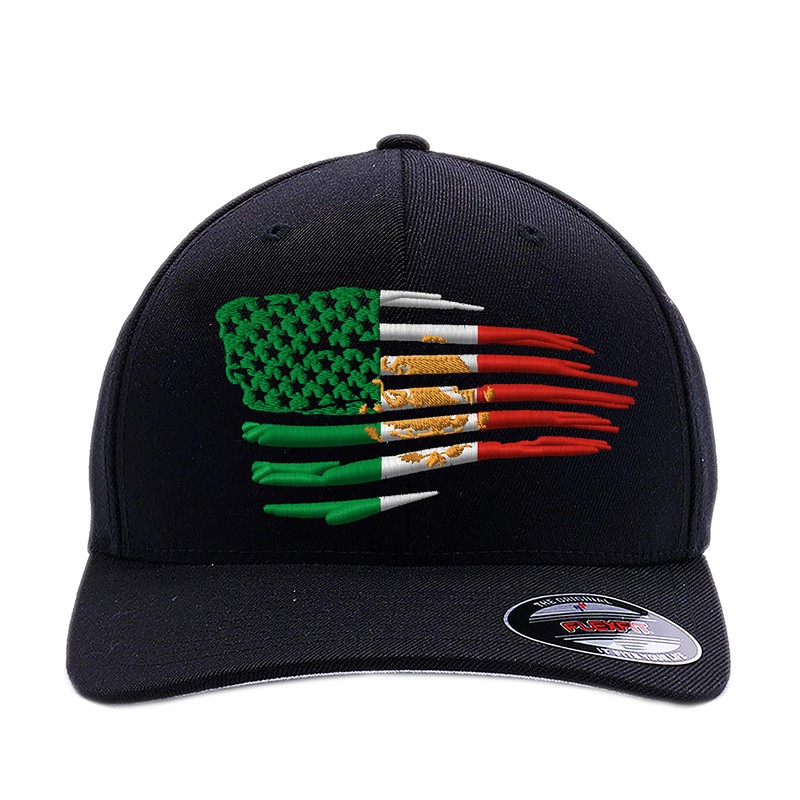 The original Flex fitted hat with USA and MEXICAN flag combination design embroidered on the front.