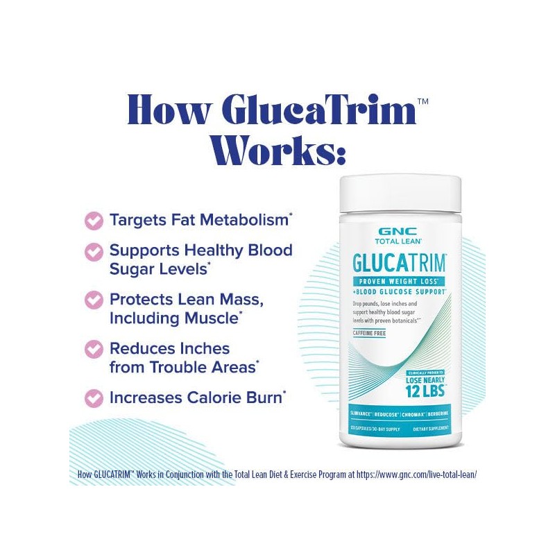 - PROVEN WEIGHT LOSS: If youre tired of feeling like your body is working against you, give your weight loss goals a boost with GNC Total Lean GlucaTrima multi-action weight loss supplement designed to help drop pounds and lose inches with proven botanicals