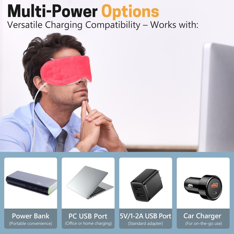 - 【Universal USB Power Supply】 Powered through standard 5V/1-2A USB ports, this warming eye mask can be conveniently operated using laptops, power banks, or car chargers for use anywhere, anytime. (Please note: USB power adapter is not included in the package)