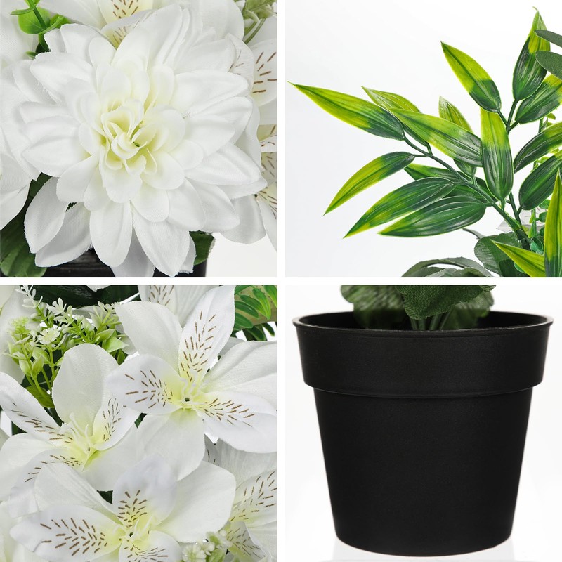 - [Fake Flowers in Vase] -Each artificial potted flower comes pre-arranged in a black plastic pot (2.7" x 2.7" x 3"), perfectly sized to brighten up your space without overwhelming it. The total height is approx. 9.8 inches, just right for tabletops, shelves, or countertops