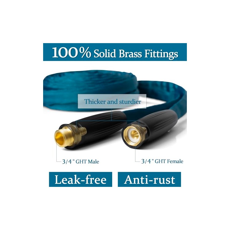 - [ Solid Brass Fittings ] Gnimihz garden hose is equipped with heavy-duty 100% solid brass 3/4" GHT Female and Male ends that are Leak-free, anti-rust, and break-proof. Fits all standard taps, spray nozzle, lawn sprinkler, watering timer, and watering wand.