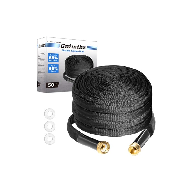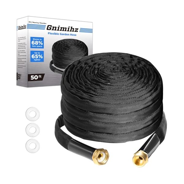 Gnimihz Garden Hose 50ft, Made of TPE(Not PVC), Ultra-Light & Flexible Water Hose with Solid Brass Fittings, Non-Shrinking, Easy to Storage, Drinking Water Safe Material, All-weather, Black, Newbox | Gnimihz
