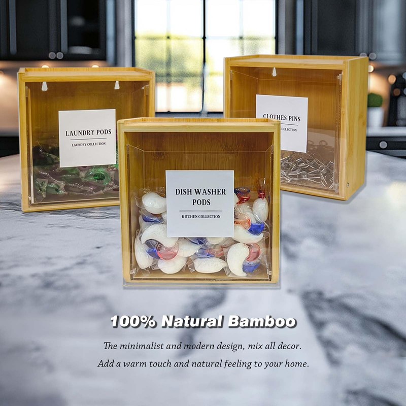 - LAUNDRY PODS CONTAINER:Our laundry pod container is made of premium acrylic & real bamboo, crystal clear windown allows you an unobstructed view to identify the contents and be ready to replenish quickly. The minimalist and modern design, mix all decor. Add a warm touch and natural feeling to your home.