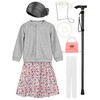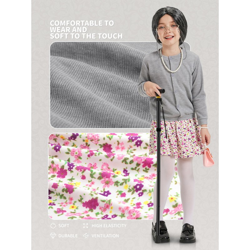 - Complete costume set: Our 100 days of school costume for Kids includes 1 old lady wig for kids with a wig cap and curling wand, 1 old lady costume cardigan and 1 floral dress, 1 glasses with glasses chain, 1 metal cane, 1 faux pearl necklace and 1 bracelet, 1 purse, and 1 tights