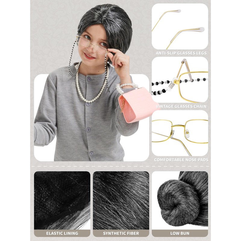 - Old Lady Costume for Kids Materials: The old lady wig is made of synthetic polyester fiber, offering a realistic look. The old lady cardigan and dress are soft and comfortable, suitable for both 100th day of school costumes and daily wear