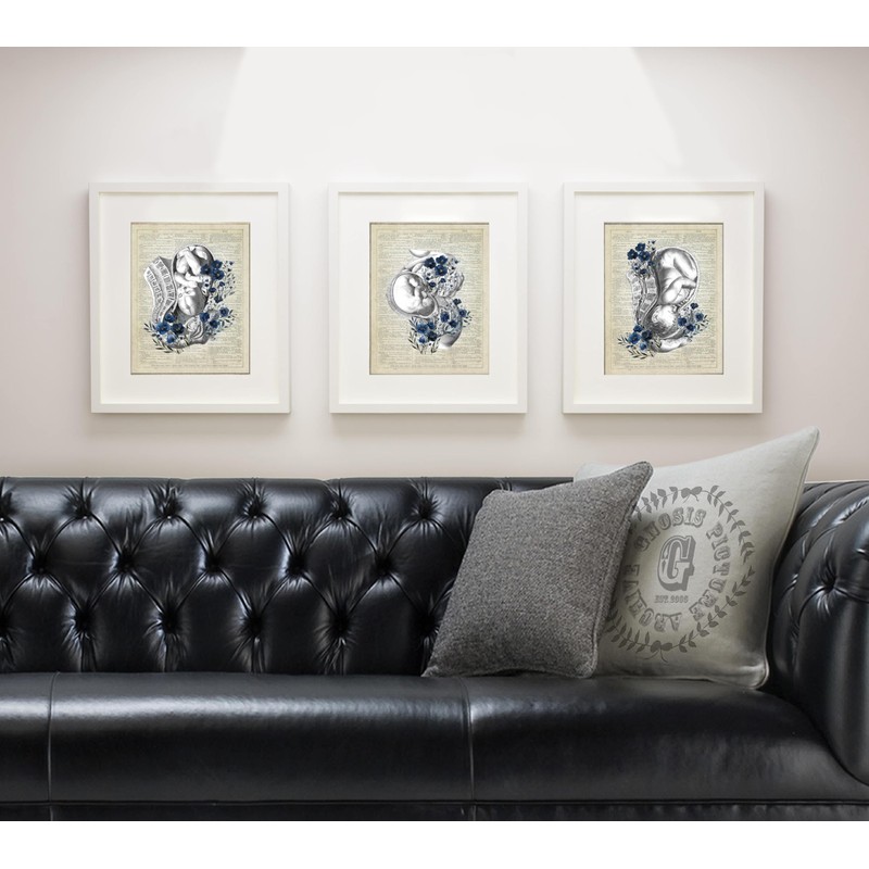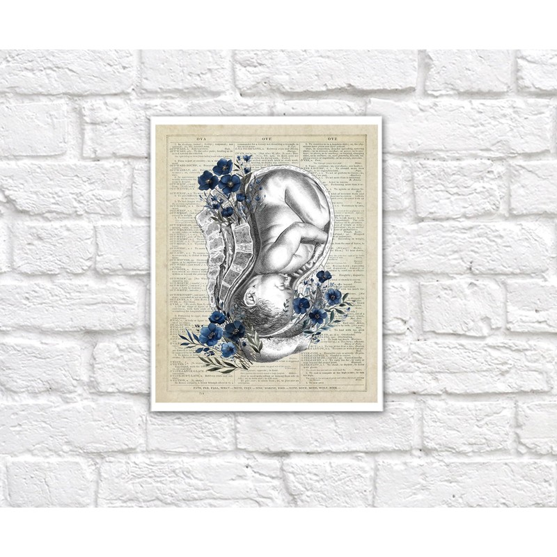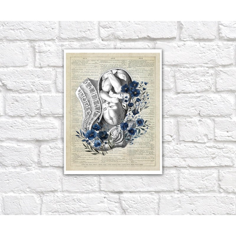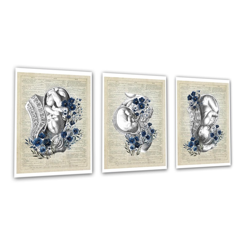 - ARTISTIC DESIGN: Beautiful set of 3 anatomy medical illustrations featuring fetal development inside of the womb, adorned with elegant blue floral accents on vintage dictionary page backgrounds