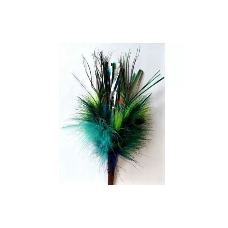 The Go Cat Sparkling Kitty Peacock Duster wand is made of shiny strips of mylar surrounding colorful feathers and attached to a 18" wand. The mylar makes that wonderful rustling sound when swished and is sure to attract your cat's attention during playtime. As with all other cat wand toys, it is meant to be used during supervised playtime. Please inspect the toy often and remove / replace if it becomes damaged during play. Made in the USA. Colors of Feathers & Mylar may vary.