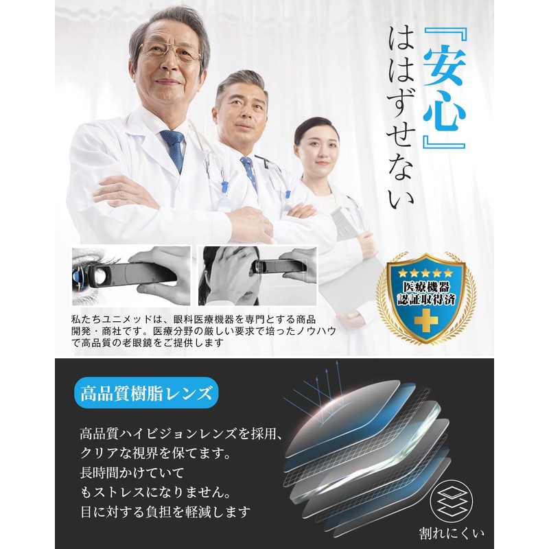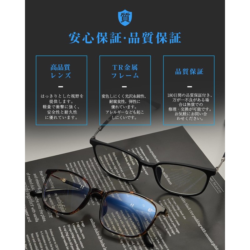 • 【高性能フレーム・一体型鼻パッド】●フレームにはTR金属を採用し、耐腐食性や、熱変形のしづらさ、形状記憶性、柔軟性に優れ、アレルギーなどが起こしにくいです。●フレーム一体型鼻パッドは外部からの衝撃で折れるといったことが起こりません。デザインと機能性を兼ね備えています。