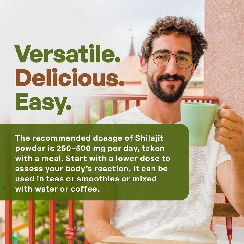- How to Use: The recommended dosage of Shilajit powder is 250–500 mg per day, taken with a meal. Start with a lower dose to assess your body's reaction. It can be used in teas or smoothies or mixed with water or coffee. You can also use our potent shilajit powder to make your own capsules at home.