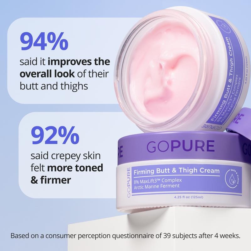 Reveal smoother, firmer skin with goPure’s advanced butt and thigh cream. Clinically tested and formulated for both women and men, this cream targets stretch marks, dimpled texture, and loose skin for a visibly improved appearance.