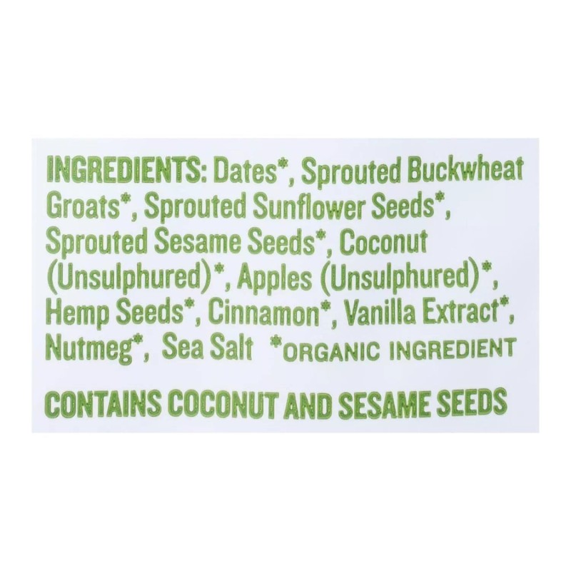 Dates*, Sprouted Buckwheat Groats*, Sprouted Sunflower Seeds*, Sprouted Sesame Seeds*, Coconut (Unsulphured)*, Apples (Unsulphured)*, Hemp Seeds*, Cinnamon*, Vanilla Extract*, Nutmeg*, Sea Salt.