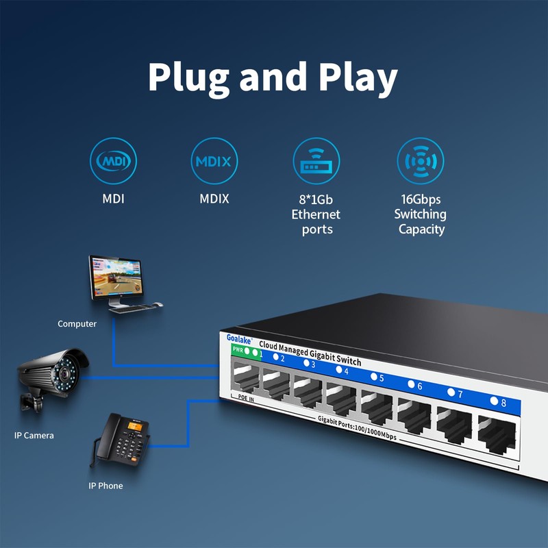 • Multifunctional Cloud Switch The Goalake Cloud Managed Switch provides visual remote management and supports IEEE 802.1Q VLAN, Port Isolation, Broadcast Storm Suppression, Port QOS and Port Traffic Limiting, Port Mirroring, Auto MDI/MDI-X and more
